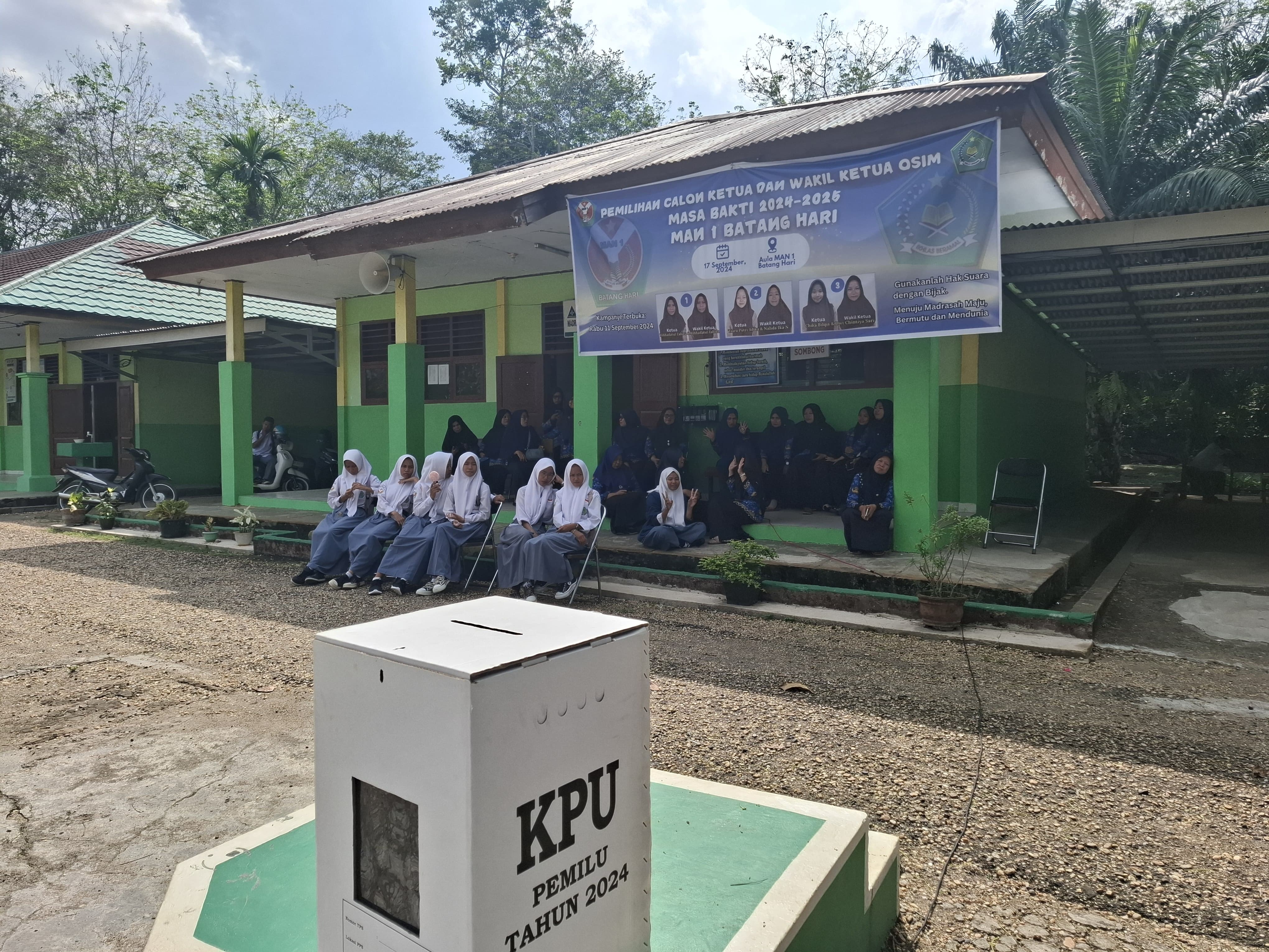 Selasa, 17 September 2024, MAN 1 Batang Hari melaksanakan pemungutan suara untuk pemilihan ketua dan wakil ketua OSIM masa bakti 2024/2025. Kegiatan tersebut dilaksanakan di aula MAN 1 Batang Hari, di mana seluruh siswa dan siswi memberikan suara mereka untuk calon yang mereka dukung. Proses pemungutan suara berjalan dengan tertib dan lancar, menunjukkan partisipasi aktif dari seluruh civitas akademik sekolah.