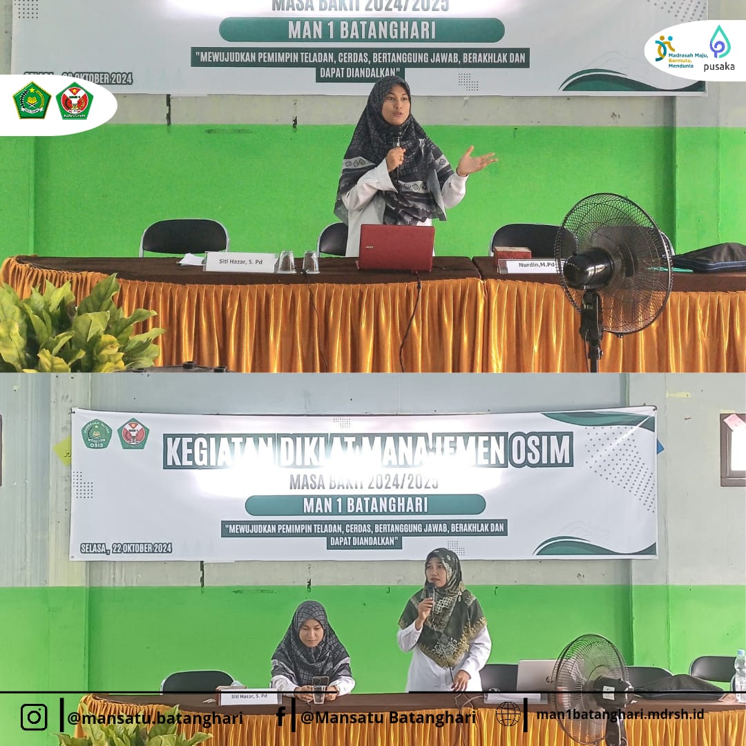 Diklat ini juga menghadirkan beberapa materi lain, termasuk kesekretariatan yang disampaikan oleh Siti Hazar, S.Pd.I, serta dinamika kelompok yang disampaikan oleh Ika Hesty Anggraini, S.Pd. Peserta diharapkan dapat mengaplikasikan ilmu yang diperoleh dalam mengelola OSIM dengan lebih baik dan profesional selama masa bakti 2024/2025. Acara ini menjadi langkah awal untuk mencetak pengurus OSIM yang tangguh dan siap menghadapi berbagai tantangan dalam menjalankan tugas organisasi.