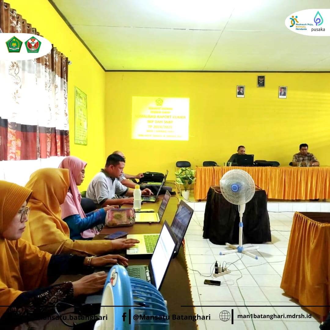 Batanghari, 6 Desember 2024 - Menyusul selesainya asesmen madrasah semester ganjil tahun ajaran 2024/2025, Kepala Madrasah MAN 1 Batanghari, Drs. Ali Permadi, M.Pd.I, menggelar rapat sosialisasi pengisian rapor, pengisian SKP (Sasaran Kinerja Pegawai) tahunan, dan persiapan Seleksi Nasional Berdasarkan Prestasi (SNBP) bagi siswa kelas 12.