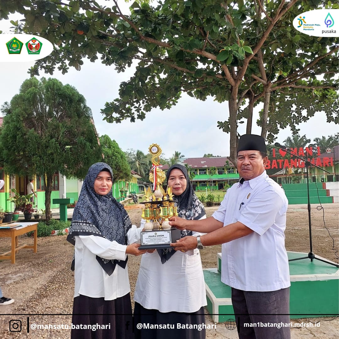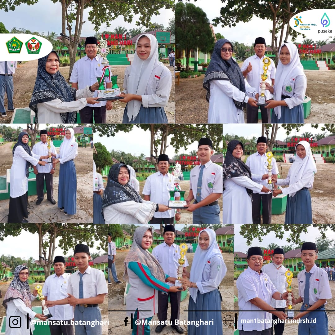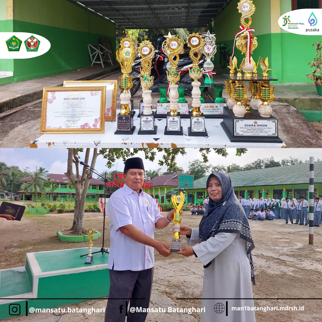 Kepala MAN 1 Batang Hari secara langsung menerima piala-piala tersebut dari para perwakilan tim dan siswa yang berprestasi. Di antara penghargaan yang diserahkan adalah Juara I lomba perpustakaan tingkat MA se-Kabupaten Batang Hari, yang menunjukkan kualitas pengelolaan perpustakaan MAN 1 Batang Hari sebagai salah satu yang terbaik di daerahnya.