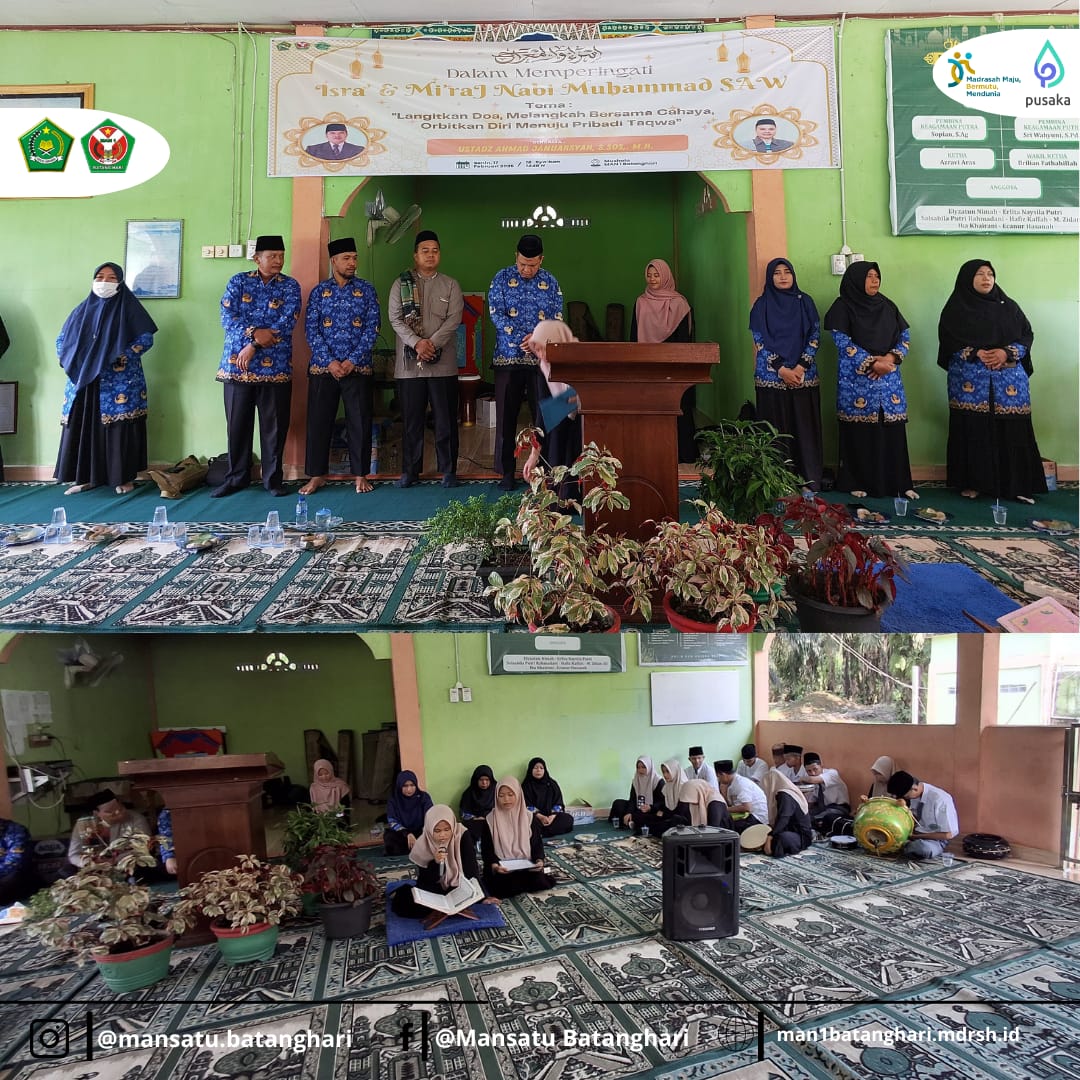 Batanghari, 17 Februari 2025 - MAN 1 Batanghari menggelar peringatan Isra Miraj Nabi Muhammad Shallallahu 'Alaihi Wasallam pada pagi ini di Mushalla Al Ikhlas. Acara yang dihadiri oleh seluruh siswa, guru, dan pegawai madrasah ini berlangsung dengan penuh kekhusyukan dan kebersamaan.