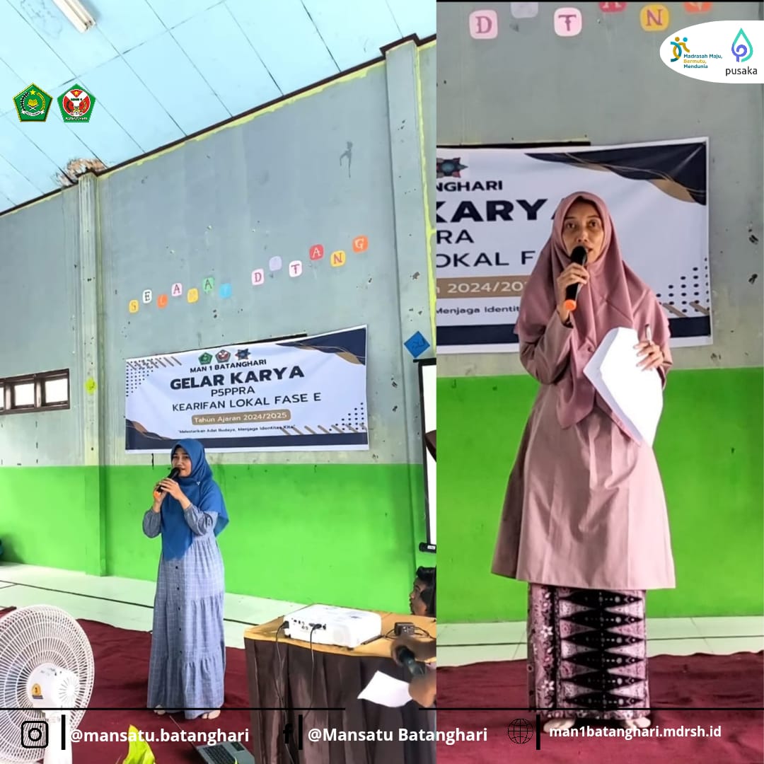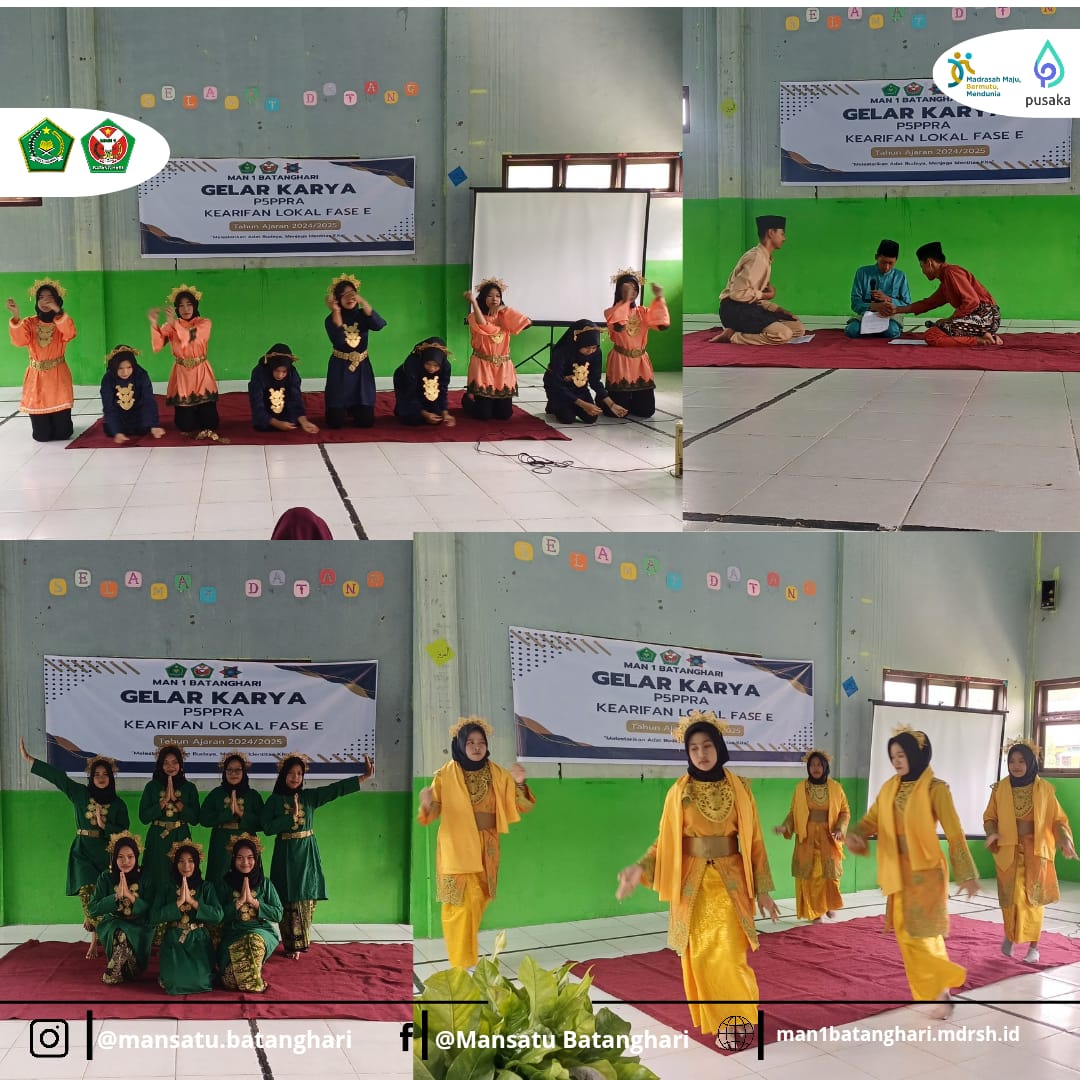 Batanghari, Jumat (21/2/2025) – MAN 1 Batanghari sukses melaksanakan Gelar Karya Projek Penguatan Profil Pelajar Pancasila dan Profil Pelajar Rahmatan Lil Alamin (P5PPRA) Fase E dengan tema proyek Kearifan Lokal. Tema yang diusung dalam kegiatan ini adalah Melestarikan Adat Budaya, Menjaga Identitas Kita, yang bertujuan untuk menanamkan nilai-nilai kearifan lokal serta memperkuat kecintaan siswa terhadap budaya daerah, khususnya budaya Jambi.