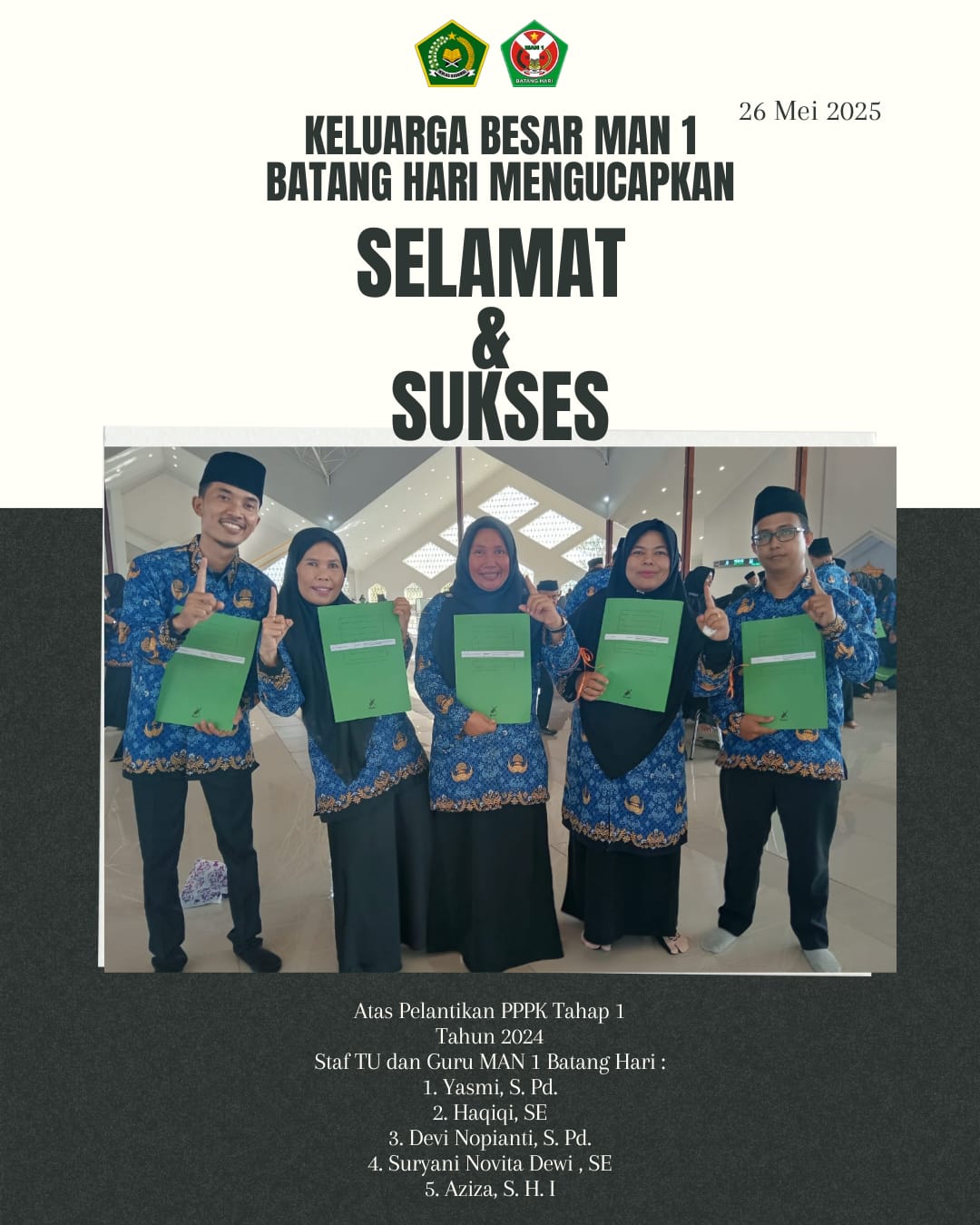 Dari jumlah tersebut, tercatat 5 orang PPPK berasal dari MAN 1 Batanghari yaitu Yasmi, S.Pd, Haqiqi, S.E, Devi Nopianti, S.Pd, Suryani Novita Dewi, S.E dan Aziza, S.H.I. Kehadiran mereka dalam pelantikan ini menjadi kebanggaan tersendiri bagi MAN 1 Batanghari, sekaligus menambah kekuatan baru dalam meningkatkan mutu pendidikan di tingkat satuan kerja.