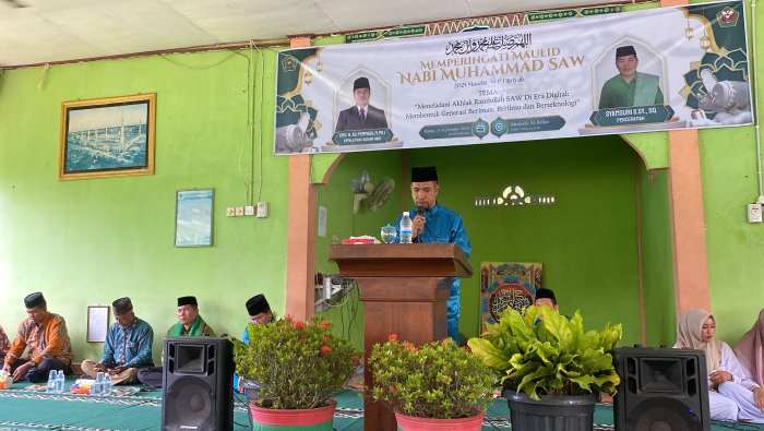 Batang Hari, 18 September 2025-Mushalla MAN 1 Batang Hari dipenuhi suasana penuh kekhidmatan dan kebersamaan pada Kamis (18/9) dalam rangka memperingati Maulid Nabi Muhammad Shallallahu Alaihi Wasallam. Acara ini dihadiri oleh seluruh siswa-siswi, para majelis guru, Kepala Madrasah Drs. H. Ali Permadi, M.Pd.I, Ketua Komite Madrasah, Pengawas Madrasah, serta tamu undangan. Kegiatan terselenggara berkat koordinasi Pembina OSIM bekerjasama dengan guru PAI dan para Pembina Keagamaan.