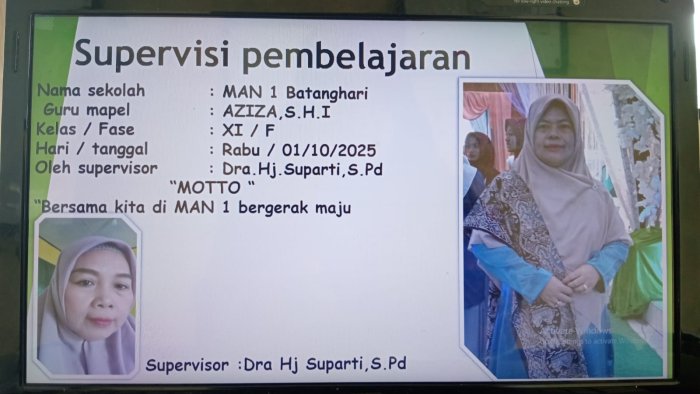 Batanghari, 1 Oktober 2025 - Kegiatan supervisi pembelajaran di MAN 1 Batanghari kembali dilaksanakan sebagai bagian dari upaya peningkatan mutu proses belajar mengajar. Kali ini, supervisi dilakukan pada mata pelajaran Geografi Fase F yang diampu oleh Aziza, S.H.I dengan materi pokok Sumber Daya Kelautan Indonesia. Kegiatan supervisi dipimpin langsung oleh Dra. Hj. Suparti selaku supervisor madrasah.