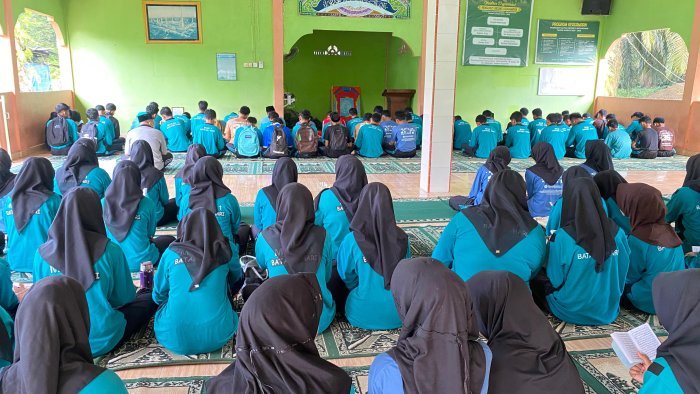 Batang Hari, Jumat 17 Oktober 2025 — Suasana Mushalla Al-Ikhlas MAN 1 Batang Hari pagi ini dipenuhi lantunan ayat-ayat suci Al-Qur’an dalam kegiatan keagamaan rutin Jumat pagi, yaitu pembacaan Surat Al-Kahfi. Kegiatan ini diikuti oleh seluruh siswa-siswi, sebagian majelis guru, serta mahasiswa PPL/PKM dari Universitas Islam Batanghari (Unisba).