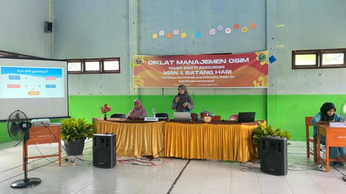 Muara Bulian-Hari kedua pelaksanaan Diklat Manajemen OSIM masa bakti 2025-2026 di MAN 1 Batang Hari berlangsung dengan suasana yang semakin dinamis dan penuh antusiasme. Kegiatan ini digelar pada Jumat, 14 November 2025, bertempat di Aula Gedung MAN 1 Batang Hari. Pada kesempatan tersebut, Wakil Kepala Bidang Hubungan Masyarakat (Waka Humas) MAN 1 Batang Hari, Yofi Tri Fadila, S.Pd, hadir sebagai pemateri utama yang menyampaikan materi public speaking dan komunikasi efektif.