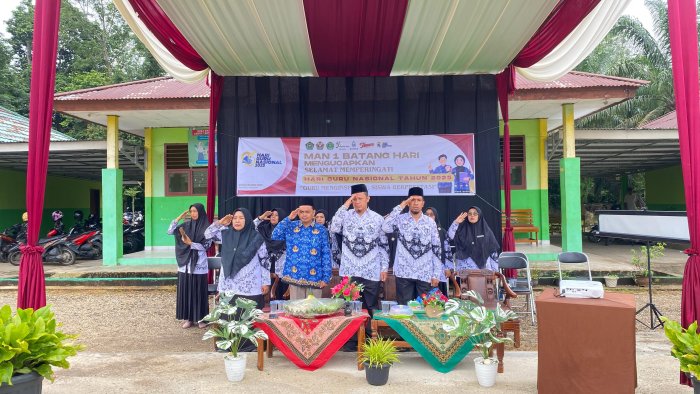 Muara Bulian-MAN 1 Batang Hari menggelar upacara peringatan Hari Guru Nasional (HGN) ke-80 tahun 2025 di halaman madrasah pada Selasa, 25 November 2025 pagi. Kegiatan ini berlangsung dengan khidmat dan penuh semangat kebersamaan, menjadi momen penting untuk menghargai jasa para guru serta menegaskan peran pendidikan dalam membangun generasi unggul di Indonesia.