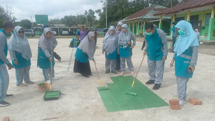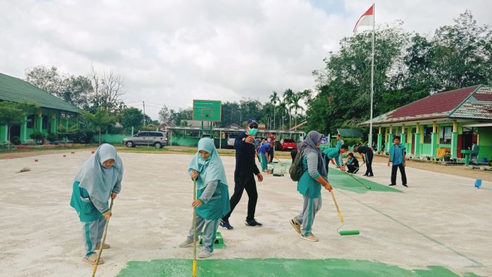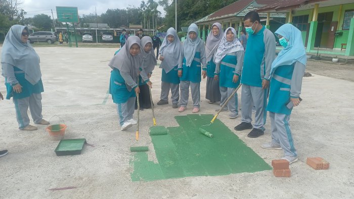 Batang Hari, 13 Februari 2026 - Suasana kebersamaan terlihat jelas di MAN 1 Batang Hari pada Jumat pagi. Seluruh warga madrasah, mulai dari kepala madrasah, Kaur Tata Usaha, staf TU, majelis guru, hingga beberapa pengurus OSIM, terlibat aktif dalam kegiatan gotong royong memperindah lapangan olahraga. Kegiatan ini difokuskan pada pengecatan lapangan dan garis lapangan serta pembersihan area sekitar.