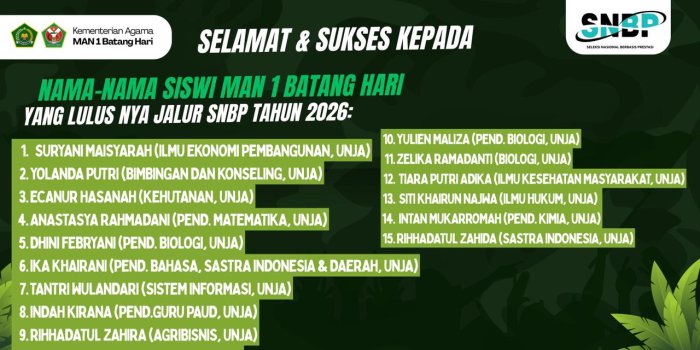 Batang Hari-Sebanyak 15 siswa Madrasah Aliyah Negeri (MAN) 1 Batang Hari berhasil lolos Seleksi Nasional Berdasarkan Prestasi (SNBP) tahun 2026. Mereka dinyatakan diterima di berbagai program studi di perguruan tinggi negeri, khususnya Universitas Jambi (UNJA). Pengumuman kelulusan ini disampaikan secara resmi melalui laman SNBP pada Selasa, 1 April 2026, pukul 15.00 WIB.